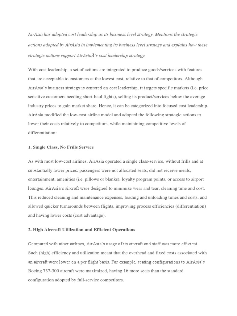The strategy was including SAFETY LOW FARE SERVICE and. As a result by using this yield management system AirAsia can understands the behavior of their customer and offering the effectives and efficiency strategy and also can allocate capacity to maximize the. Is AirAsia a cost leadership strategy.